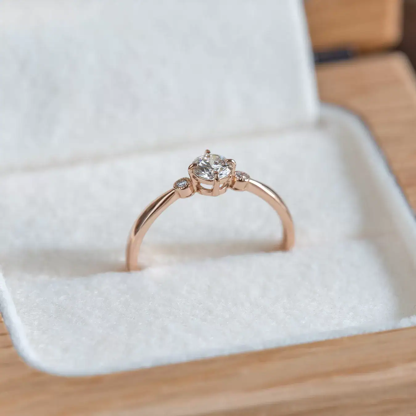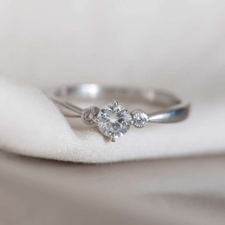 ミルグレインで留めたサイドのメレダイヤモンドと、