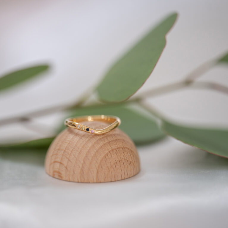イエローゴールドのオーダーリングにも4色の誕生石をセットしてご家族の絆を感じる特別なアニバーサリーリングに仕上がりました。