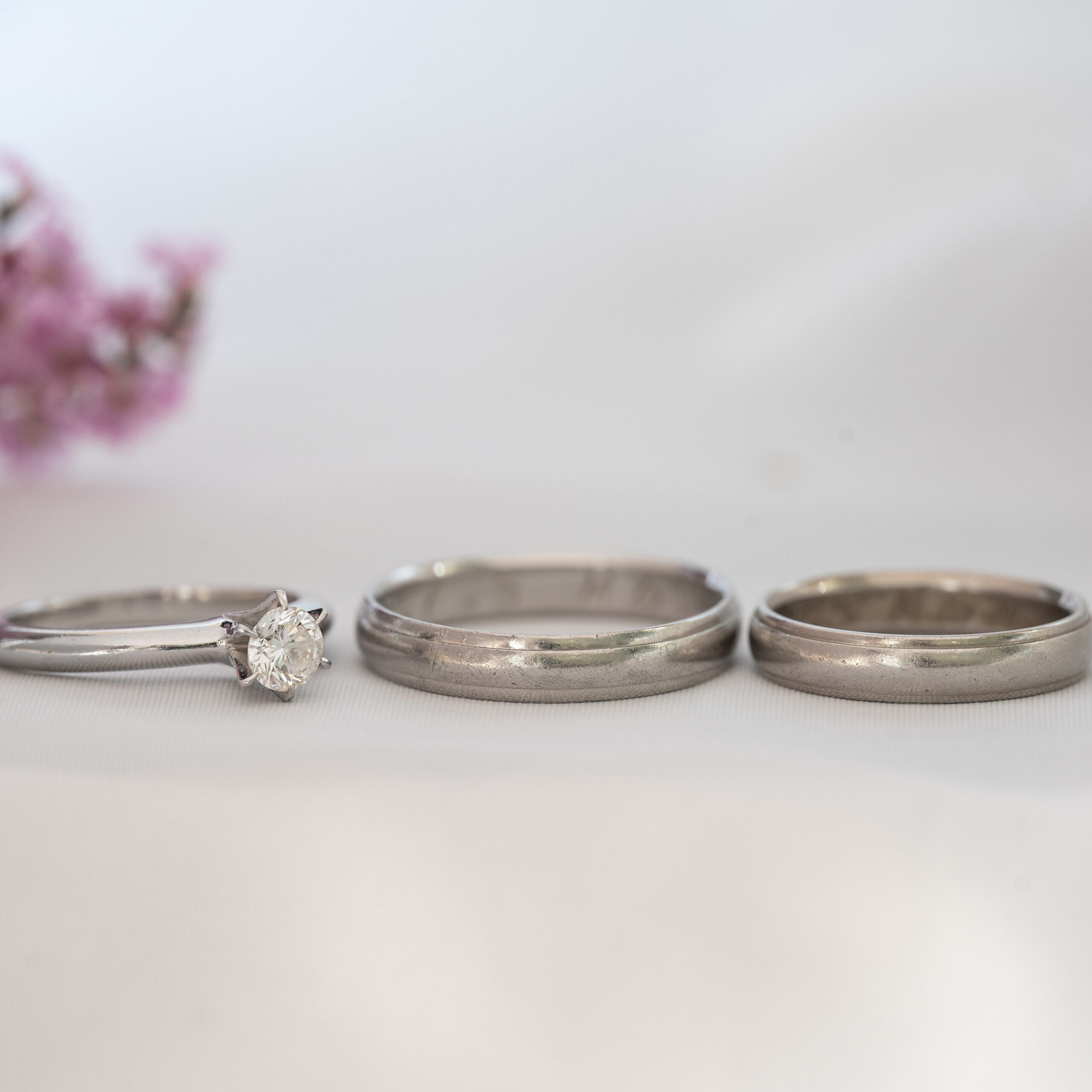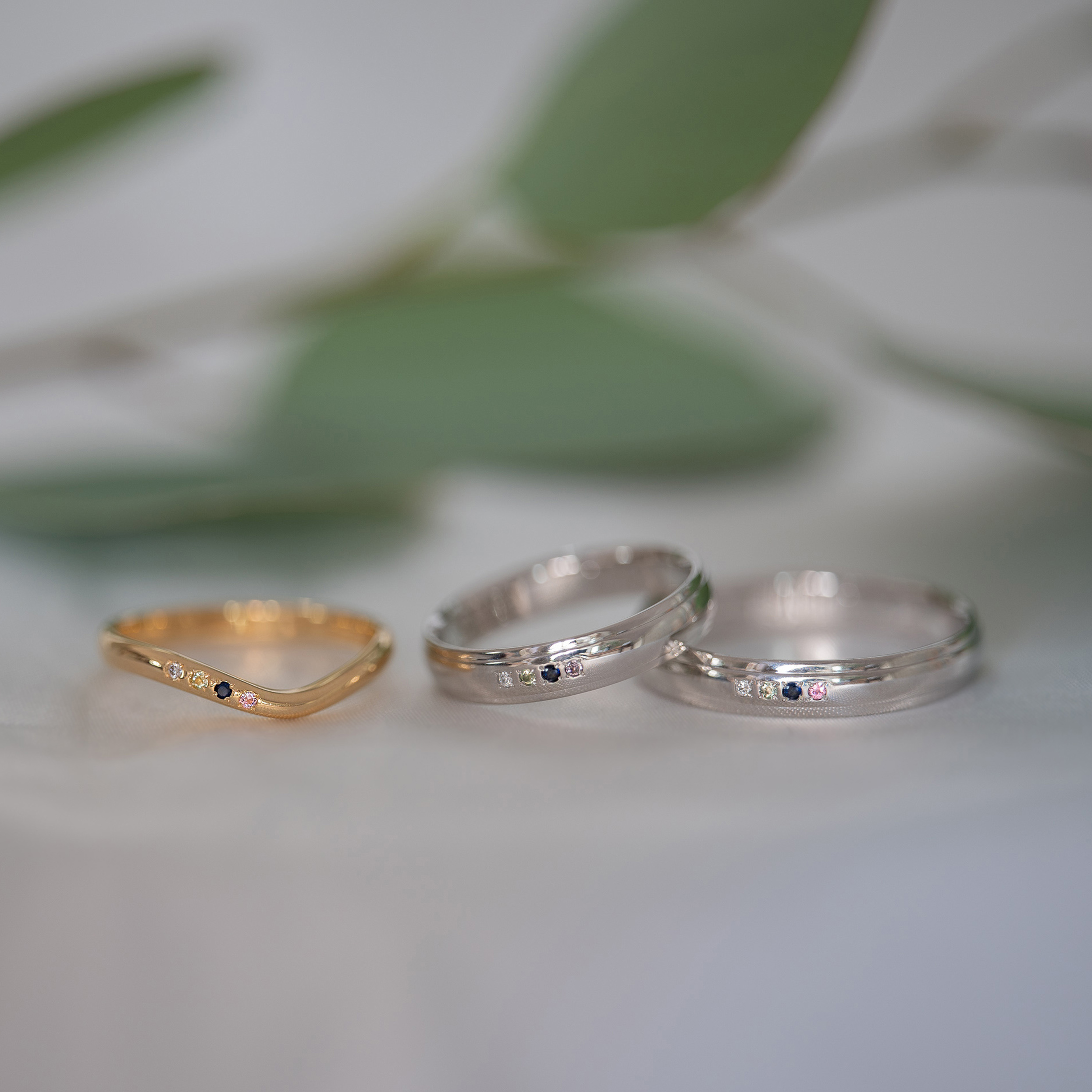 プラチナのご結婚指輪にご家族の誕生石を4ピース追加してアレンジ。