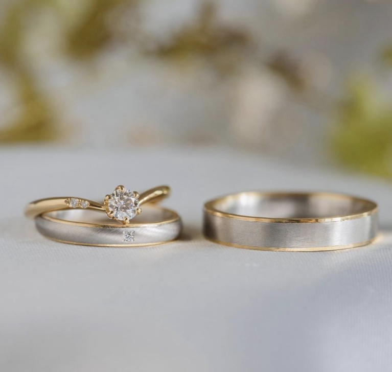 V字が美しい婚約指輪とゴールドの縁がおしゃれな結婚指輪