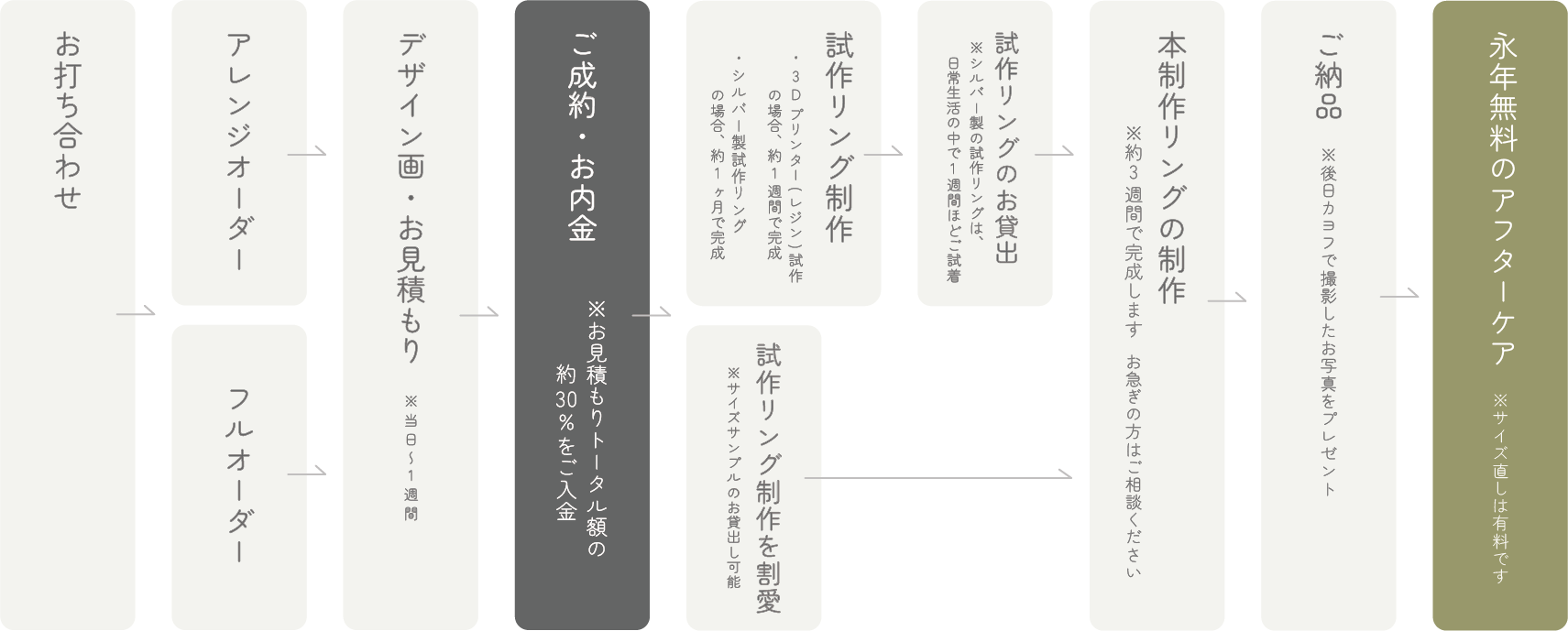 試作リングは約 1 週間程のお貸し出しが可能ですので、着け心地やお洋服との相性などしっかりとお確かめいただけます。