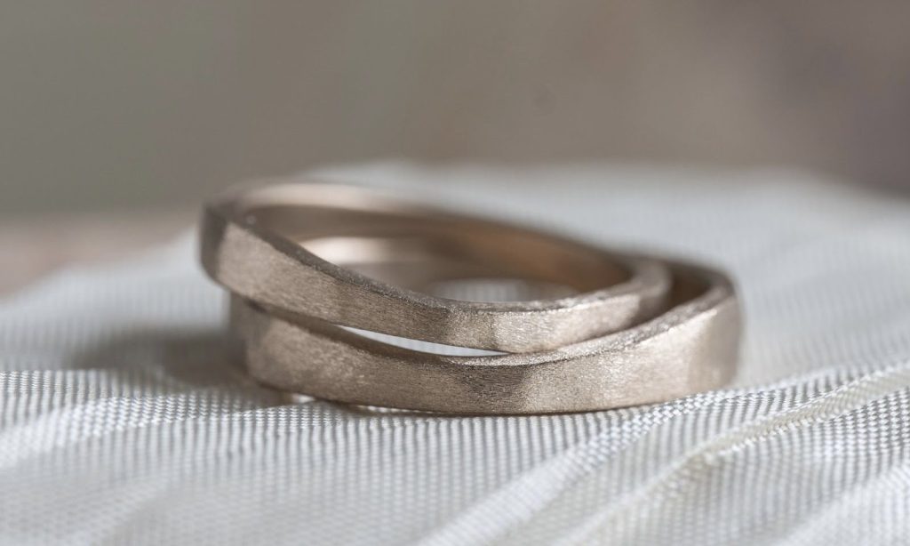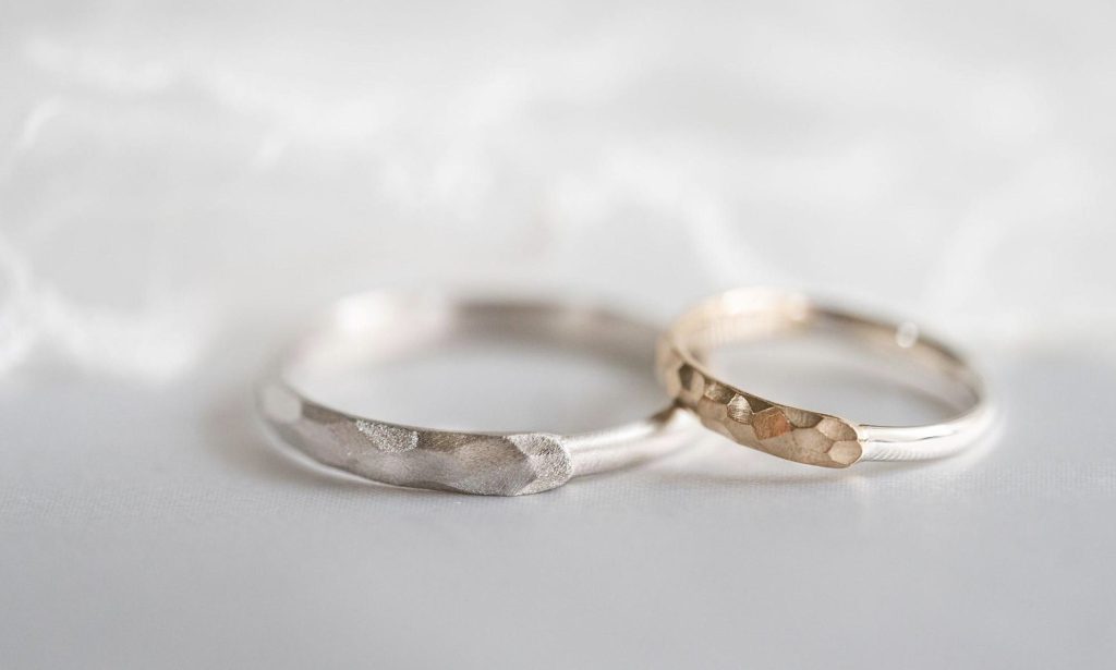 素材が違うだけに見えますが、よく見るとたたきの種類が違うご結婚指輪に仕上がっています。
